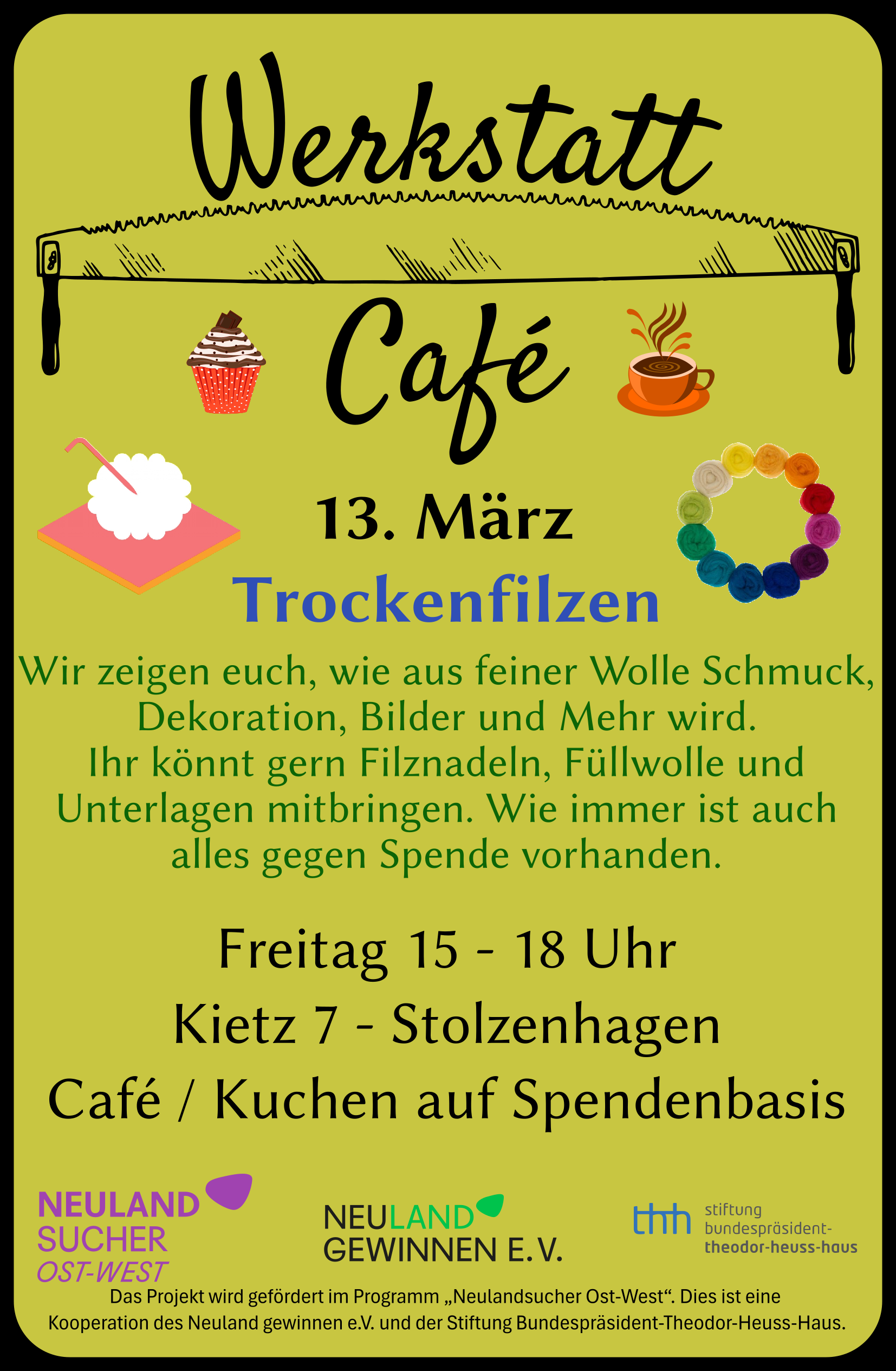 Hey, diese Woche gibt's nochmal ein Angebot mit Wolle: Skadi und Kathleen leiten Trockenfilzen an. Wer das Spinnen verpasst hat: ich bringe nochmal ein Spinnrad mit. Liebe Grüße Dany & Fabian |