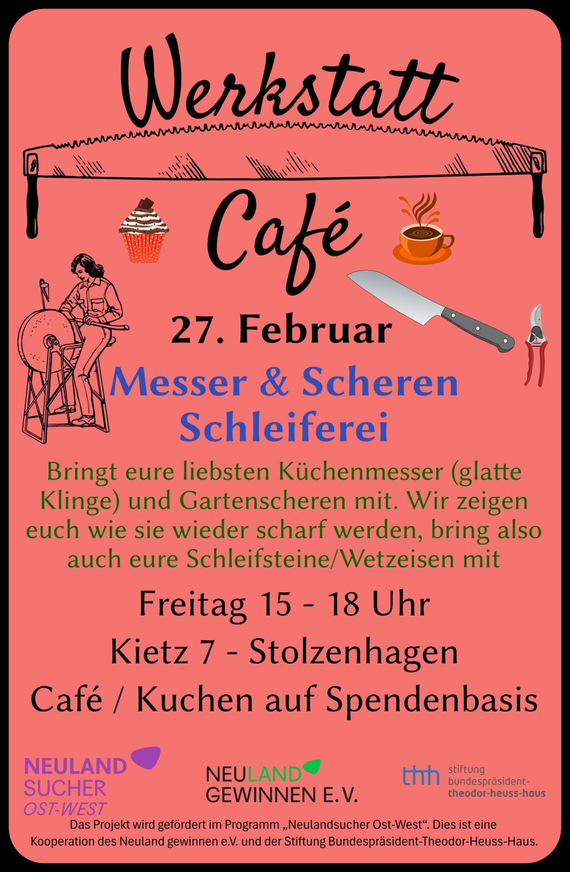 Hallo! Bringt eure liebsten Küchenmesser (glatte Klinge) und Gartenscheren mit. Wir zeigen euch wie sie wieder scharf werden, bring also auch eure Schleifsteine/Wetzeisen mit, dass ihr wisst, wie ihr sie zu Hause eigenständig weiter schleifen könnt. Das Angebot begleitet David, das Café Simone & Kathrin. Danke dafür! Liebe Grüße Dany & Fabian